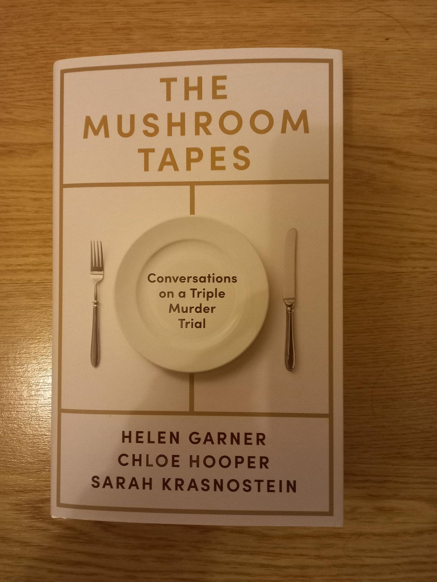 Second, and which is more why I’ve posted again so soon is that I bought (and finished, just last night), The Mushroom Tapes by Helen Garner, Chloe Hooper and Sarah Krasnostein (courtesy of reading Jessica Stanley’s excellent newsletter which you need in your lives). This is a book about the murder that took place in 2023, by Erin Patterson, who hid death cap mushrooms in a beef Wellington dish which she fed to extended family members. The book, originally intended as a podcast, cleverly weaves together the perspectives of the three authors as they attend the trial and sentencing, earlier this year.